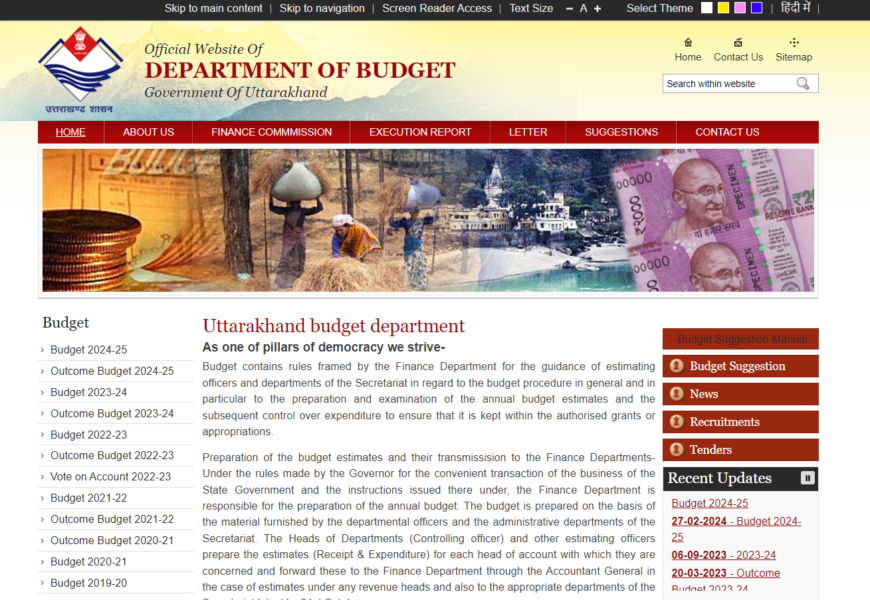 The Uttarakhand Budget website offers comprehensive information about the state’s budget, including financial allocations, expenditure reports, and budgetary processes. It aims to provide transparency and accessibility to budget-related data for citizens, policymakers, and other stakeholders.