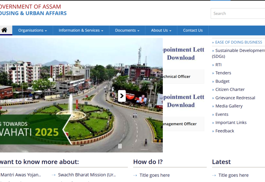 The website of the Department of Housing & Urban Affairs, Assam, provides detailed information on various initiatives and services related to urban planning, housing, and urban development in Assam. It links to multiple sub-organizations, such as the Assam State Housing Board, Guwahati Municipal Corporation, and more. The portal includes key services like business facilitation, client support, documents repository, guidelines, and information on ongoing projects like the Swachh Bharat Mission and Atal Mission for Urban Transformation. It also offers access to relevant policies, reports, and announcements.