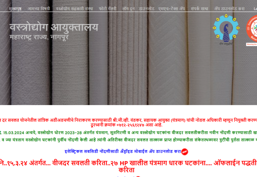 The Directorate of Textiles (Maharashtra) website provides information on policies, schemes, and initiatives to promote the textile industry in Maharashtra. It supports stakeholders with guidelines on subsidies, welfare programs, and infrastructure development. The portal highlights efforts to enhance productivity, sustainability, and employment in the textile sector while promoting traditional crafts and modern industrial practices. It serves as a resource hub for entrepreneurs, artisans, and businesses in the textile domain.