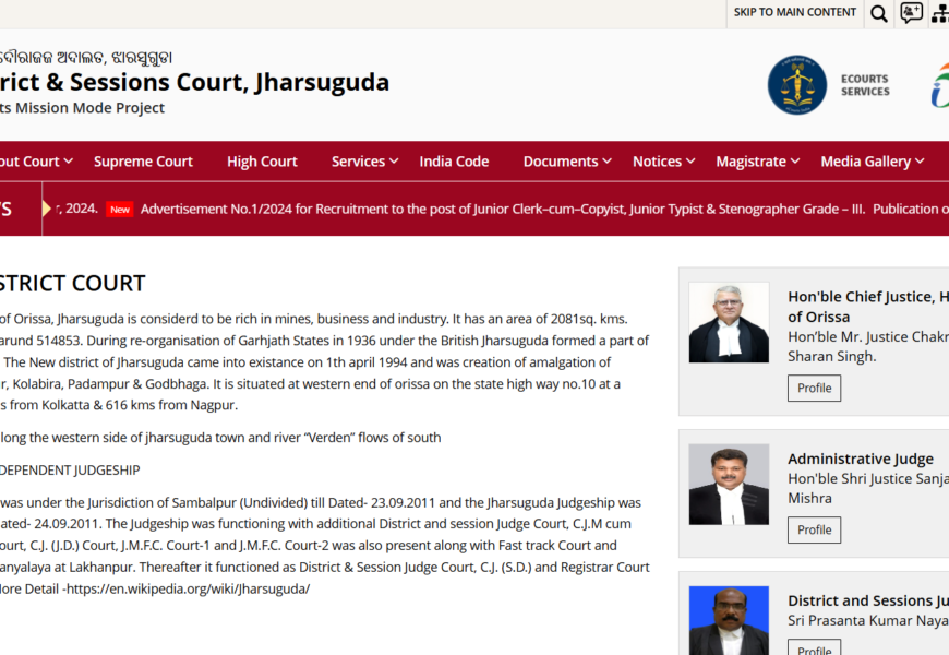 The District & Sessions Court, Jharsuguda website provides information about judicial services and proceedings in Jharsuguda, Odisha. It is part of the e-Courts Mission Mode Project, which aims to digitize court operations for improved accessibility and transparency. The website offers updates on case statuses, court orders, judgments, and notifications. It also provides resources such as court schedules, application forms, and filing guidelines, making it easier for the public and legal professionals to access court-related services. Visit the District & Sessions Court, Jharsuguda for more details.