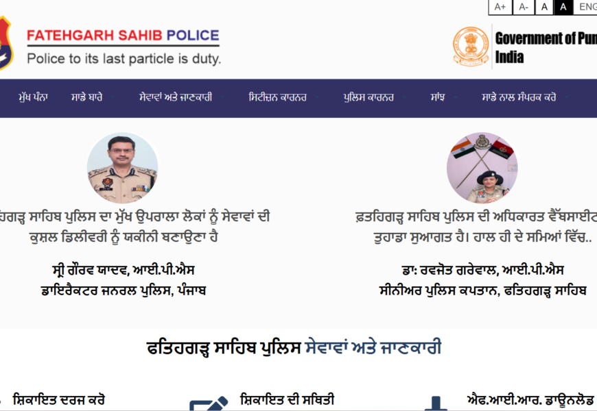 The website offers details on law enforcement services in Fatehgarh Sahib, including updates on crime prevention, police station contacts, and the filing of complaints.
