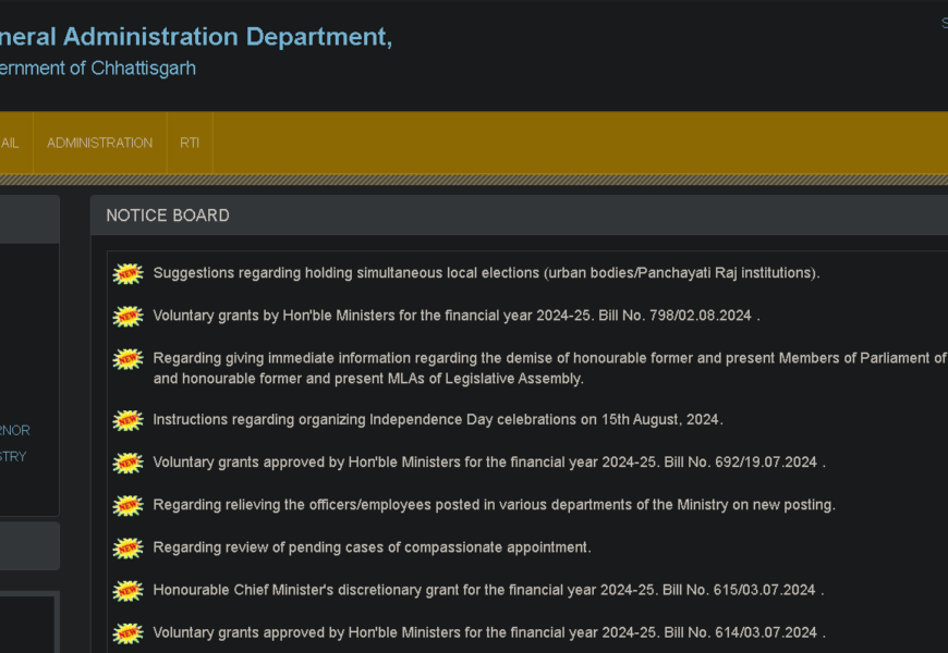 The link you’ve provided is for the official website of the of Chhattisgarh, India. This department is typically responsible for overseeing administrative functions within the state government, including managing personnel, implementing policies, and ensuring the smooth operation of government affairs.