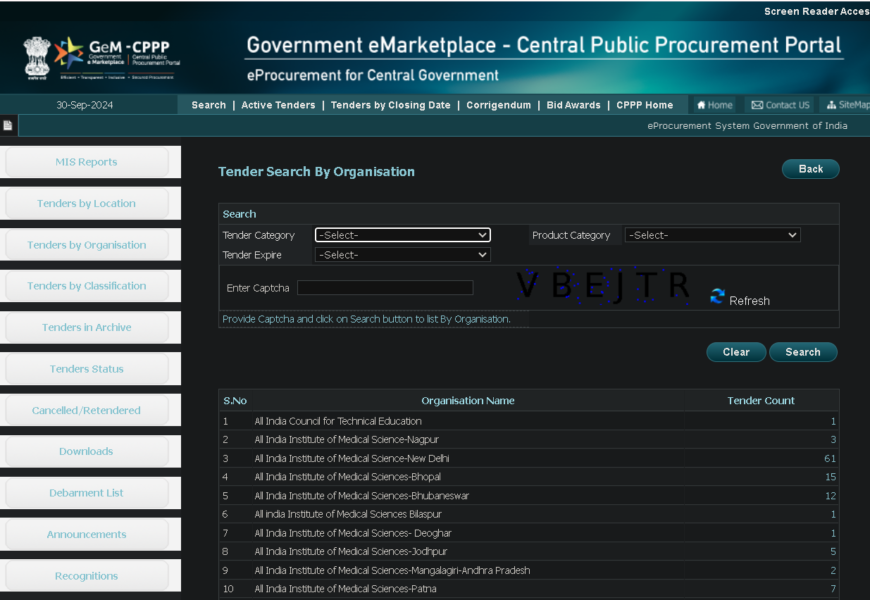 • The website provides access to tenders published by government departments and organizations, including: