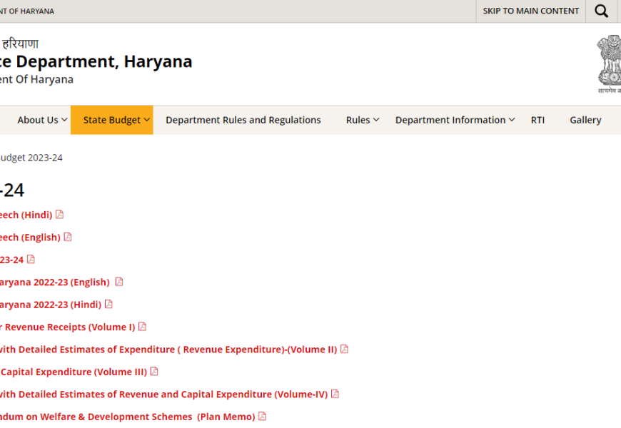 The link leads to the Haryana government’s budget page for the financial year 2023-24. This site typically features: