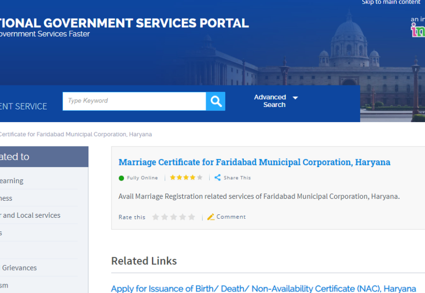 The link you provided leads to the India Government Services portal for applying for a marriage certificate specifically for the Faridabad Municipal Corporation in Haryana. This site typically includes: