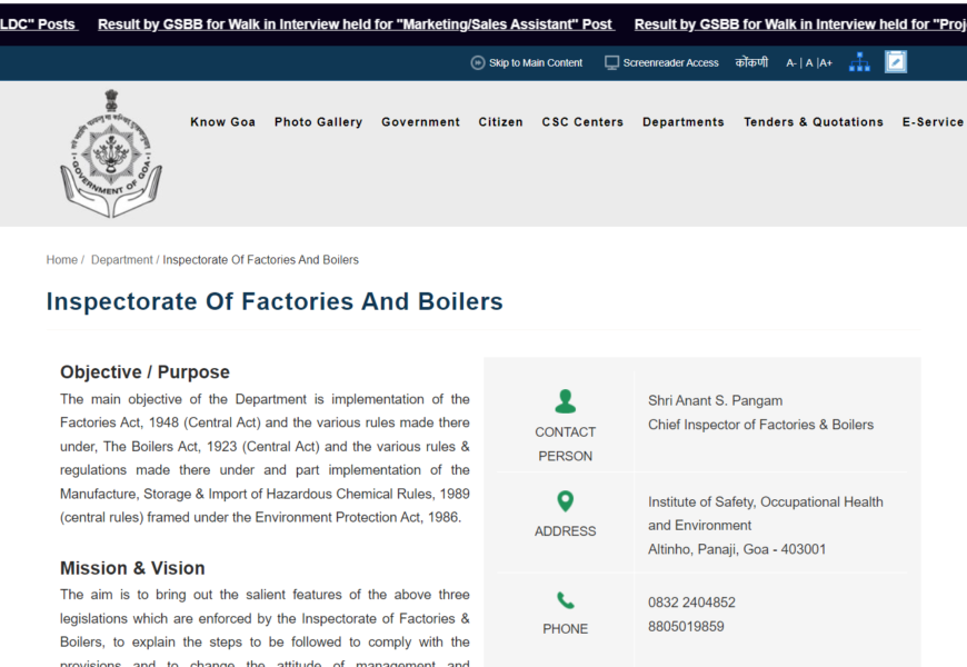 This department oversees the safety, health, and welfare of workers in factories and industrial establishments in Goa. It enforces regulations regarding industrial safety and the functioning of boilers. (https://www.goa.gov.in/department/inspectorate-of-factories-boilers/)