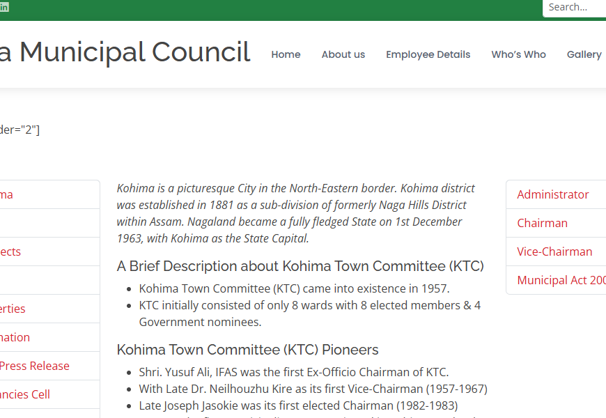 The website of the Kohima Municipal Council (KMC) provides information about the administrative body responsible for managing civic services in Kohima, the capital of Nagaland. It outlines the history of the Kohima Town Committee, established in 1957, and its evolution into the KMC, which now manages 19 wards covering 11 square kilometers. The site includes details on services, public information, municipal guidelines, and contact information.