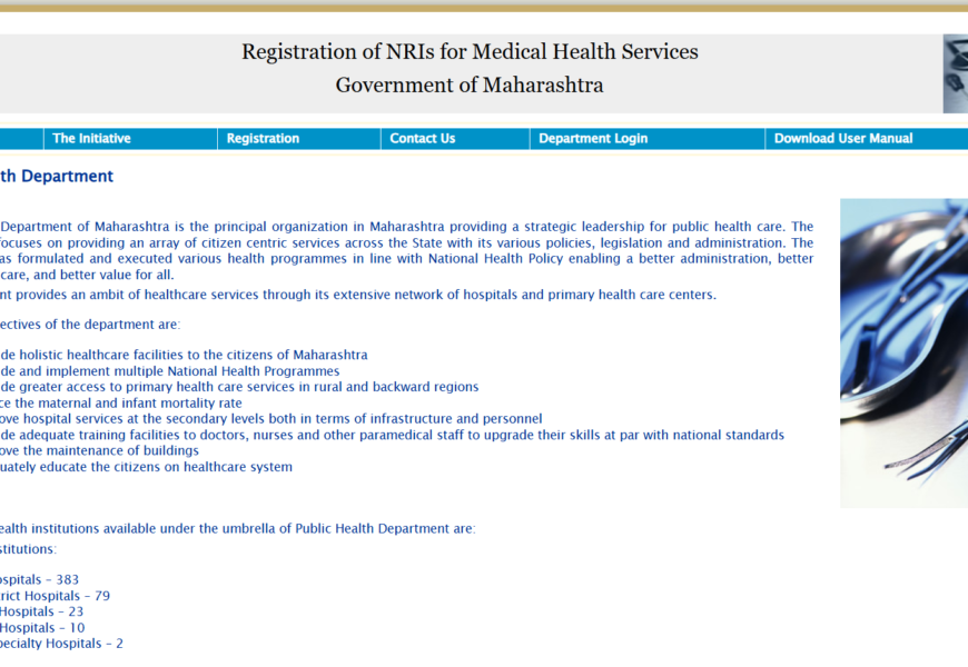 The Maharashtra Health and NRI Registration Portal is an online platform for Non-Resident Indians (NRIs) and residents of Maharashtra to access health-related services. The portal allows NRIs to register for medical schemes and health services offered by the state government. This is particularly helpful for those living abroad who wish to access healthcare in Maharashtra.