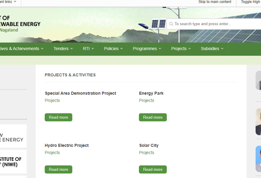 The Nagaland Department of New & Renewable Energy (NRE) website focuses on the state’s renewable energy initiatives, including solar, wind, and hydroelectric projects. It highlights government programs like the PM-Kusum scheme and various energy policies. The site offers information on projects such as solar city development, energy parks, and subsidies for renewable energy solutions, promoting sustainable energy use across Nagaland.