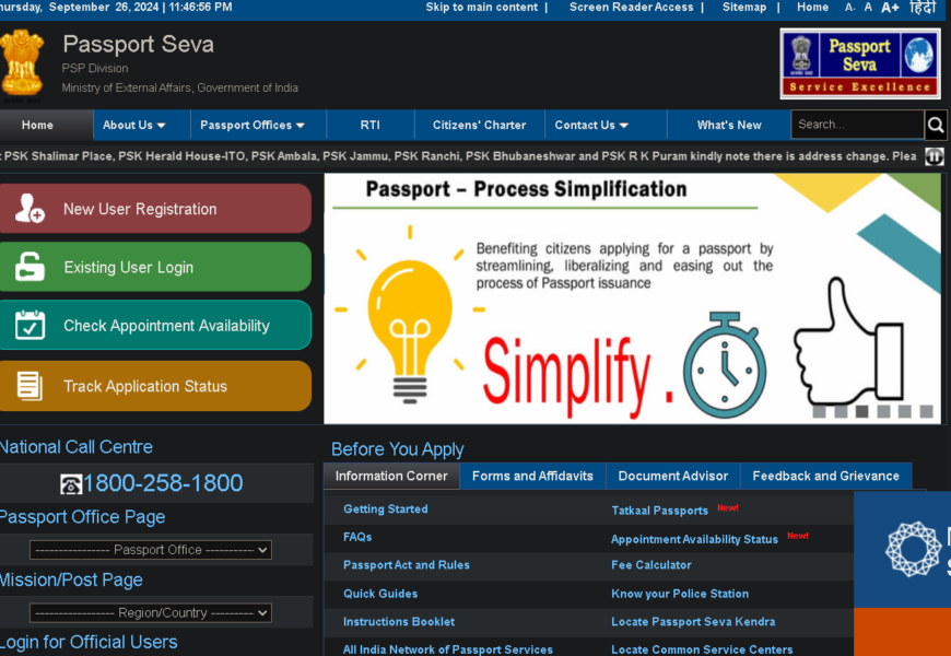 • The platform offers contact details for assistance, including helplines and links to regional passport offices.
