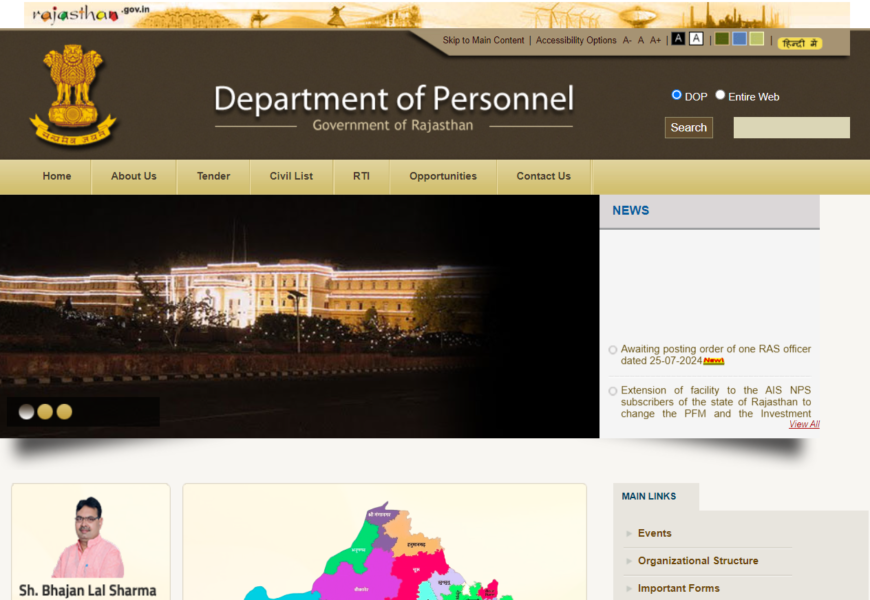 The Rajasthan Department of Personnel (DoP) website provides information on administrative services, personnel policies, recruitment, training, and career development for government employees. It also offers resources such as notifications, circulars, and forms, along with updates on promotions, transfers, and departmental exams.