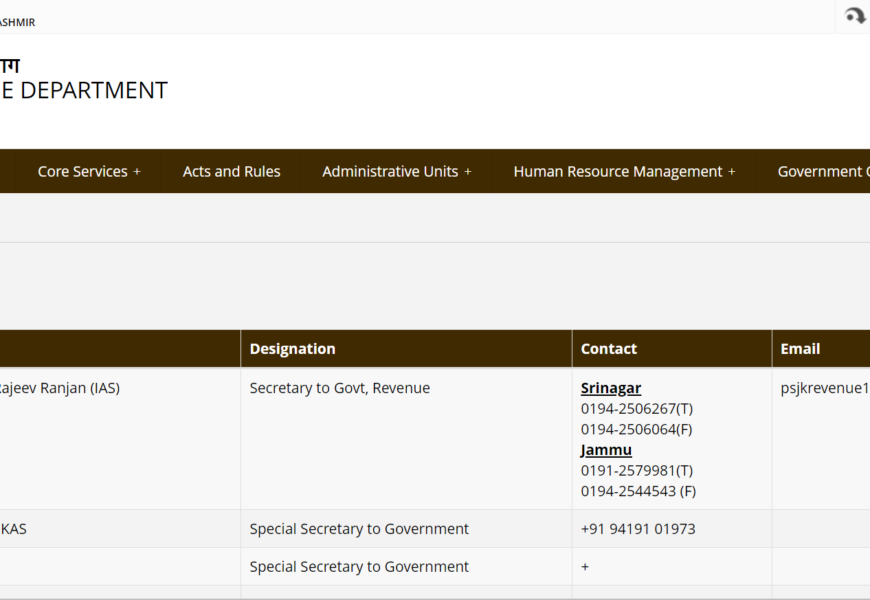 The link leads to the contact page of the Jammu and Kashmir Revenue Department’s official website. Here’s a structured overview of what you might find there: