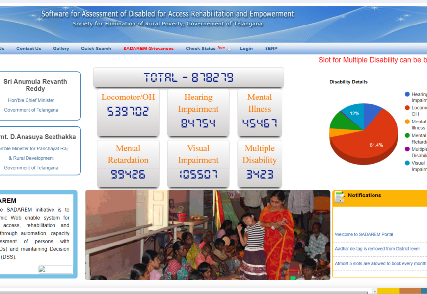 The SADAREM website is a portal dedicated to the SADAREM (Software for Assessment of Disabled for Access and Rehabilitation through Electronic Modules) program in Telangana. SADAREM is an initiative by the Government of Telangana aimed at assessing and providing assistance to persons with disabilities.